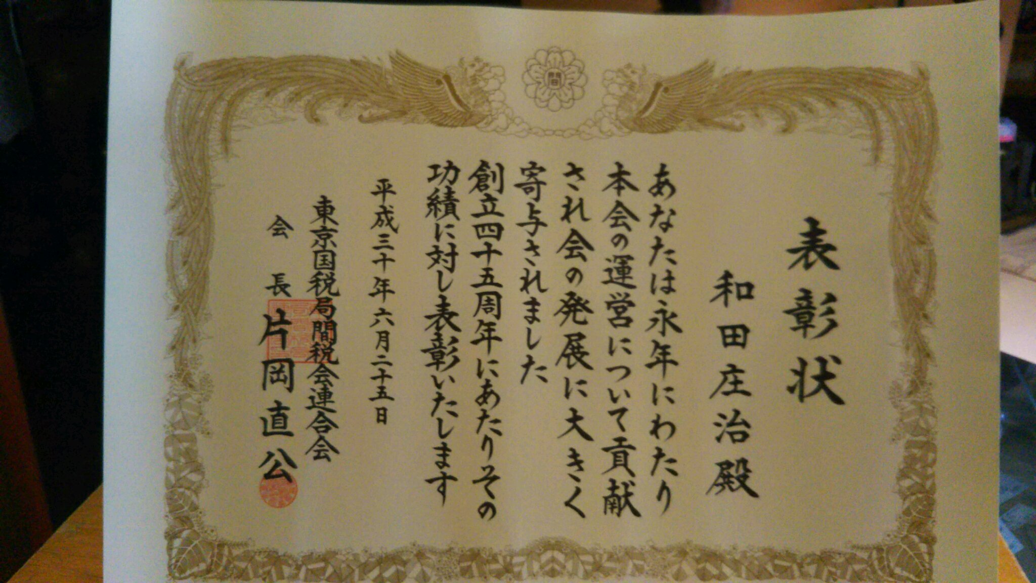 和田藤沢間税会 会長が国税長長官から表彰されました。